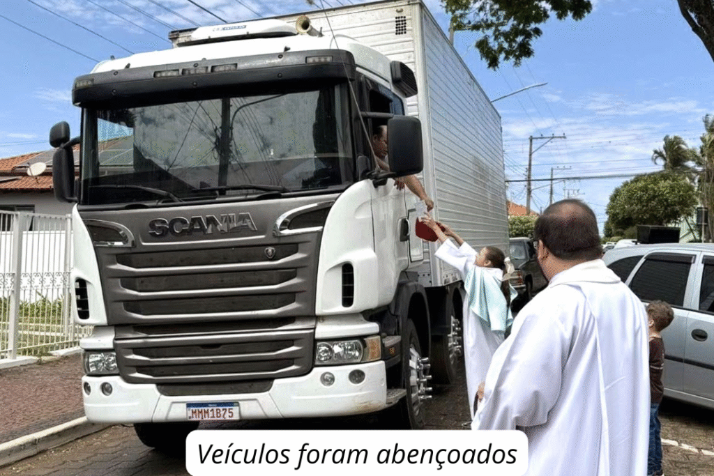 Ainda no domingo, aconteceu a tradicional carreata com bênção dos veículos, realizada em frente à Igreja Matriz pelo padre Blener e pelos acólitos, em um momento de devoção e fé.