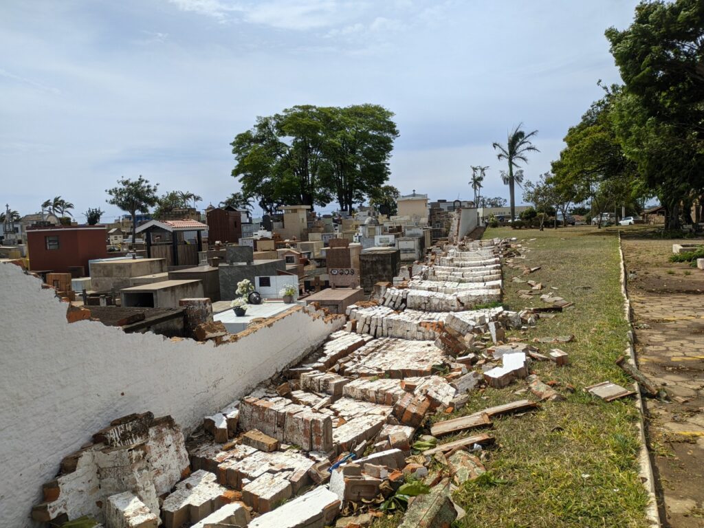 Na Avenida Ângelo Gerdullo, parte do muro do Cemitério Municipal desabou, enquanto na Praça Irmãos Ferreira as tendas instaladas para a Festa da Padroeira Santa Teresinha também sofreram danos.