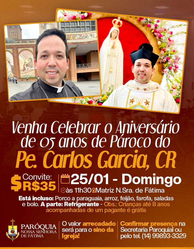 A Paróquia Nossa Senhora de Fátima, em Fartura, celebra no domingo, dia 25, os 5 anos de pároco do Pe. Carlos Garcia, CR., a partir das 11h30.